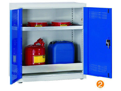 用于污染液體的存儲,可調式隔板,上下25mm可調 可移動式底部貯存盤高100mm,無縫焊接,更好防泄漏 門板的頂部及底部帶通風孔,自然通風,門開啟角度12。 隔板/貯存盤式層板每層最大承重60KG (可抽出式除外) 柜體最大承重承重:300KG